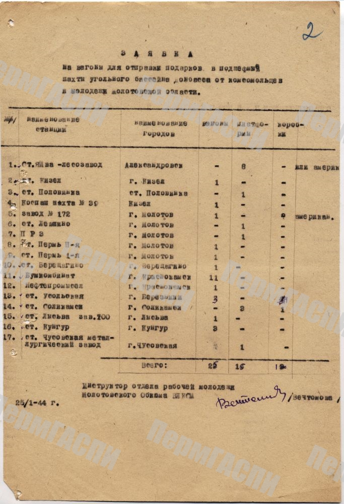 Заявка на вагоны для отправки подарков от комсомольцев Молотовской области работникам угольных шахт Донбасса. 25 января 1944 г. ПермГАСПИ. Ф.1458. Оп.1. Д.392. Л.2