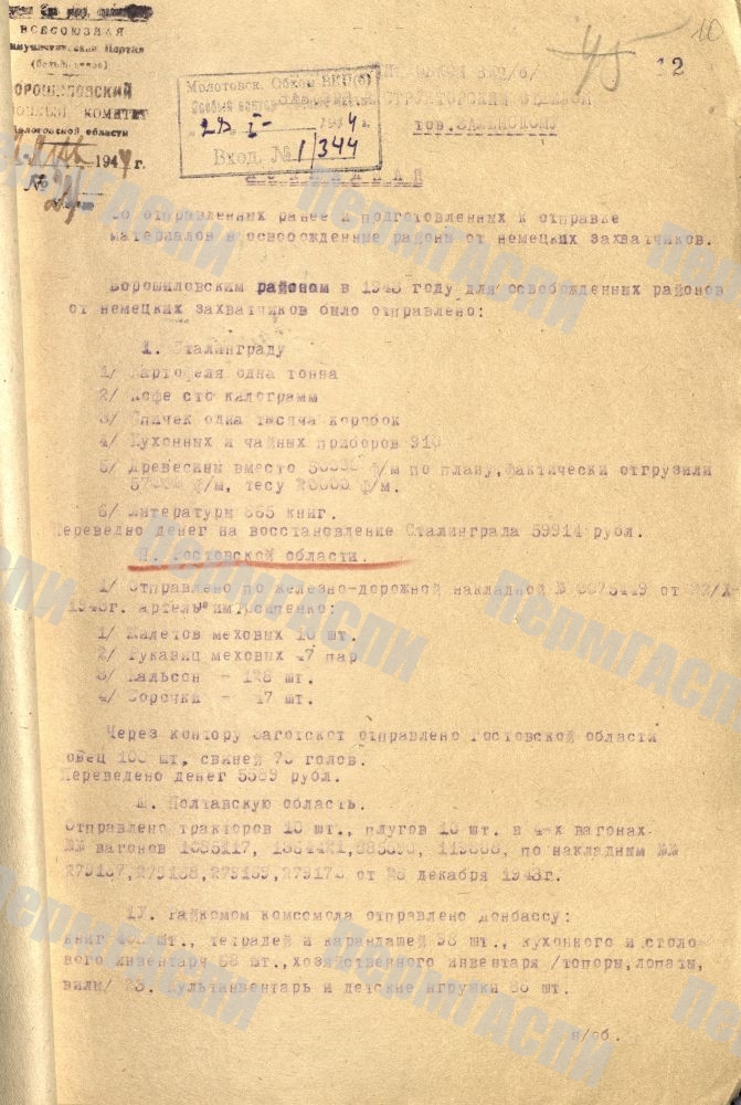 Докладная записка об участии жителей Ворошиловского района Молотовской области в оказании помощи регионам Советского Союза, освобожденным от германской оккупации, в том числе и Донбассу. 28 января 1944 г. ПермГАСПИ. Ф.105. Оп.10. Д.245. Л.10