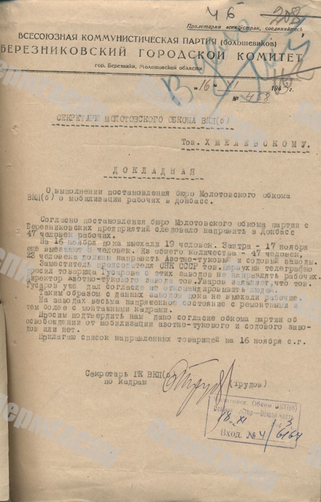 Докладная записка о выполнении в г. Березники постановления бюро Молотовского обкома ВКП(б) о мобилизации на территории Молотовской области специалистов для восстановления промышленности Донбасса. 16 ноября 1943 г. ПермГАСПИ. Ф.105. Оп.9. Д.304. Л.46, 47