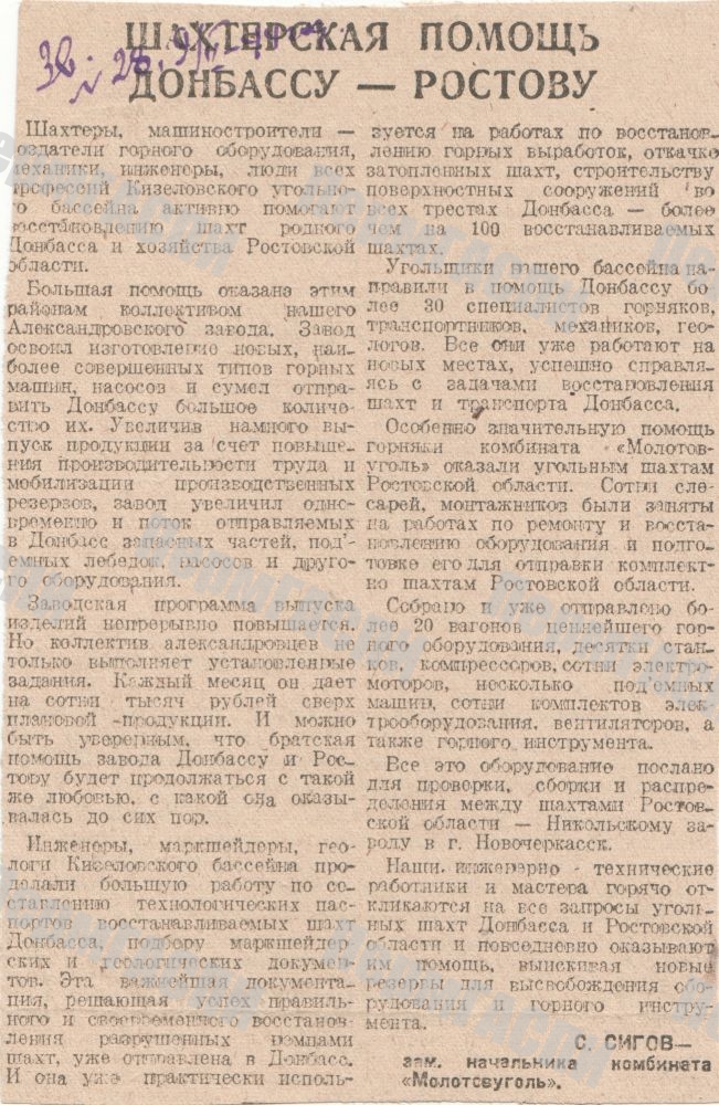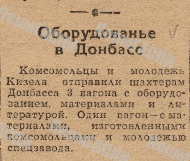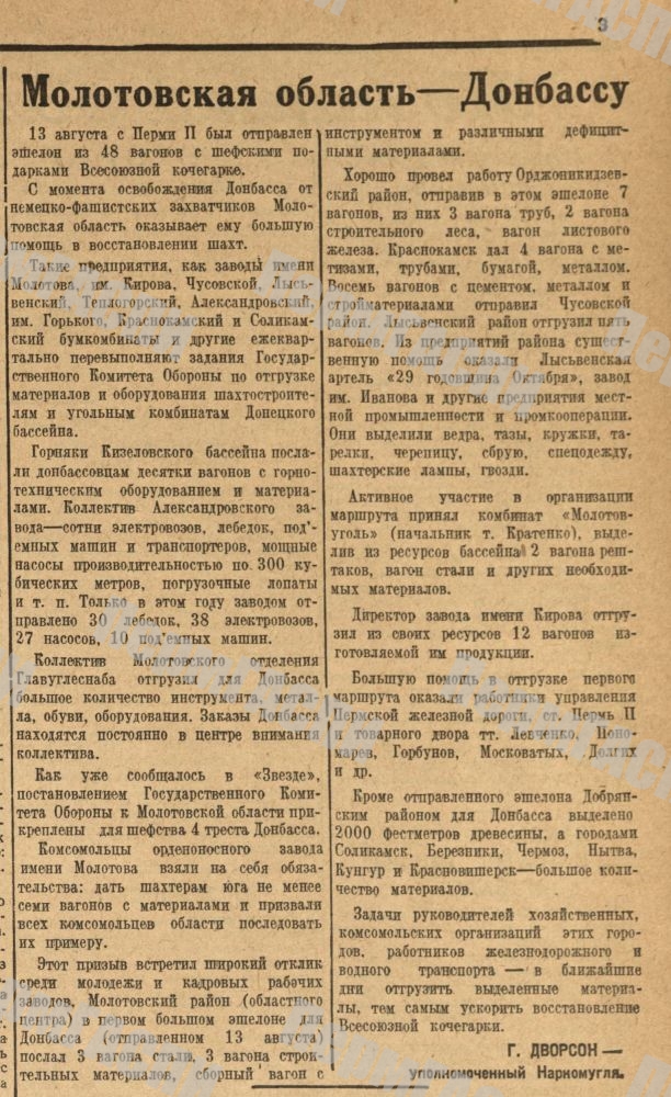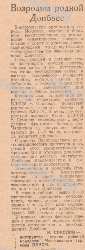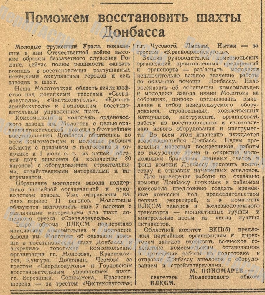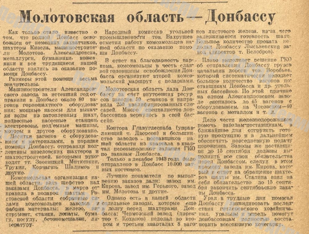 В 1943-1945 гг. Молотовская область оказывала большую помощь Донбассу в преодолении последствий боевых действий и германской оккупации региона. На Донбасс отправлялось промышленное оборудование, строительные материалы, инструменты, посуда, мебель, одежда, обувь и т.д. Для восстановления народно-хозяйственных объектов из Молотовской области на Донбасс направлялись инженеры, электрики, горняки, химики и др. За активное участие в оказании помощи Донбассу коллективы некоторых предприятий Молотовской области, например, Александровского машиностроительного завода им. К.Е. Ворошилова, были награждены почетными грамотами ЦК ВЛКСМ.