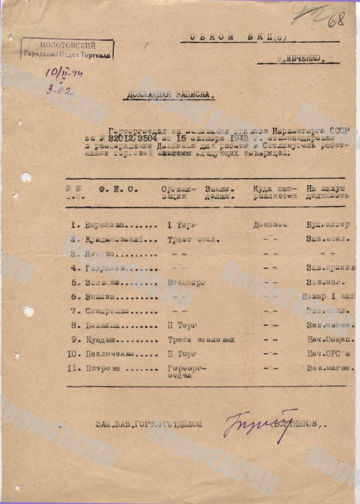Докладная записка об отправке на Донбасс работников торговли из г. Молотова. 10 февраля 1944 г. ПермГАСПИ. Ф.105. Оп.9. Л.320. Л.68
