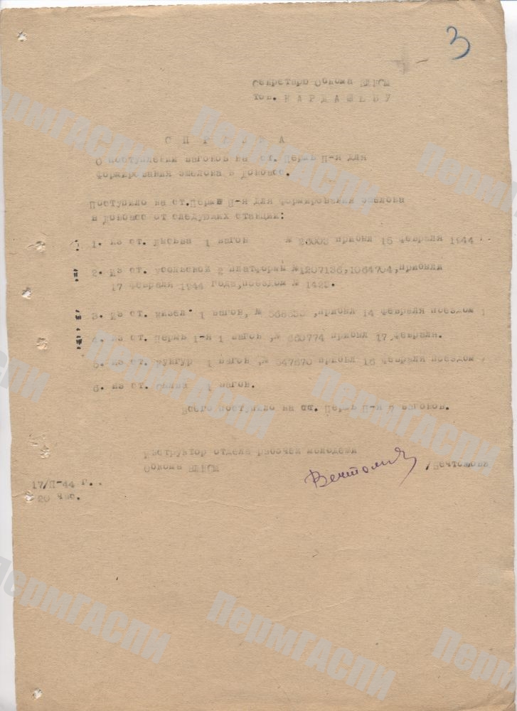 Справка о поступлении на станцию Пермь II железнодорожных вагонов для формирования эшелона с помощью для Донбасса. 17 февраля 1944 г. ПермГАСПИ. Ф.1458. Оп.1. Д.392. Л.3
