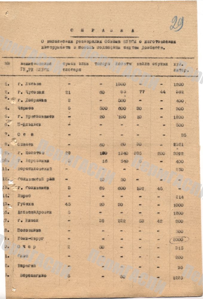 Сводка об изготовлении на предприятиях Молотовской области продукции для Донбасса и об отправке ее по назначению. Ноябрь 1943 г. ПермГАСПИ. Ф.1458. Оп.1. Д.392. Л.28