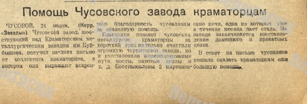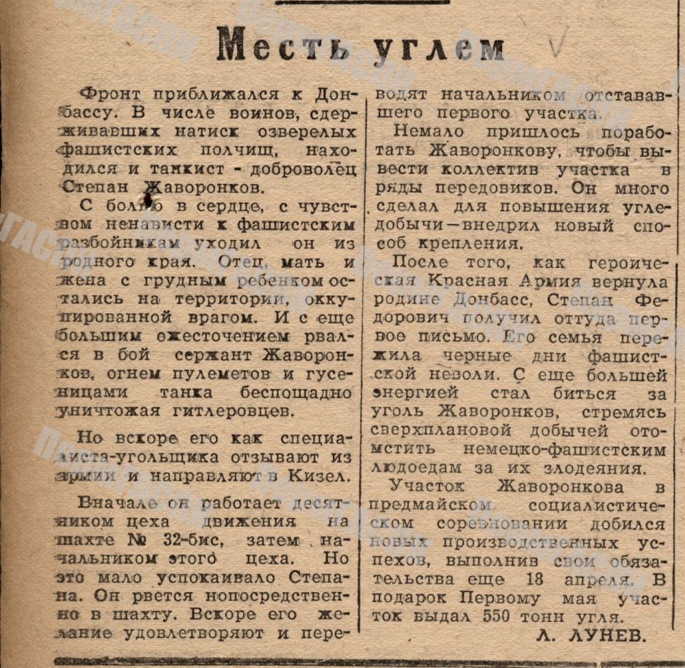 Статья, опубликованная в номере газеты «Уральская кочегарка» от 1 мая 1944 г. ПермГАСПИ. Ф.5738. Оп.312. Д.1. Л.93