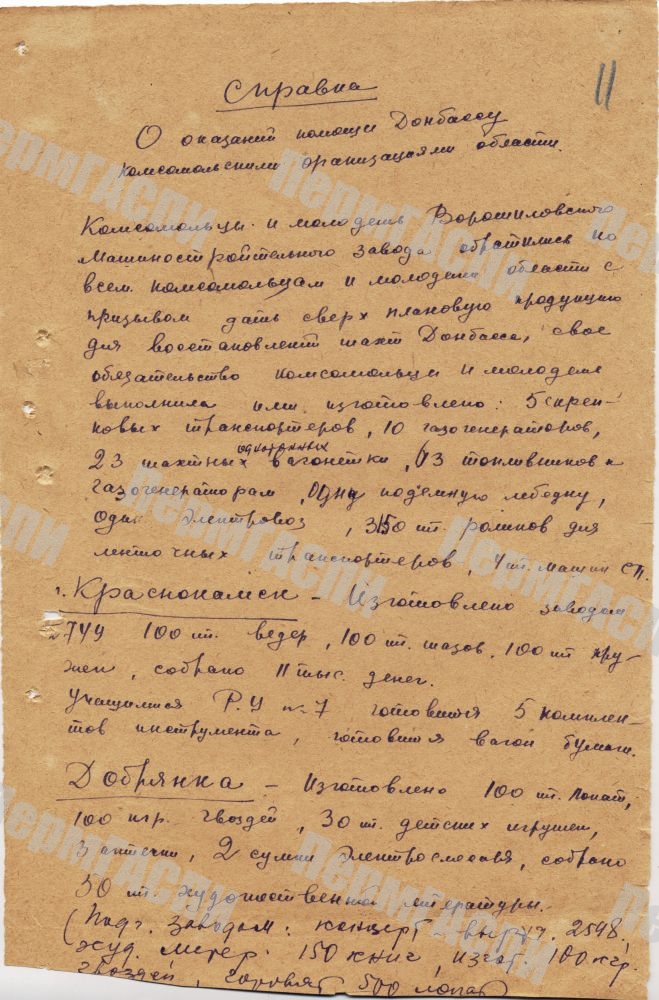 Справка о помощи Донбассу со стороны комсомольцев Молотовской области. 1944 г. ПермГАСПИ. Ф.1458. Оп.1. Д.392. Л.11-13