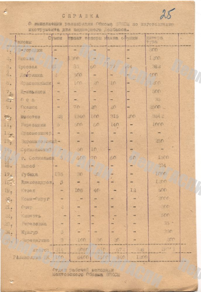 Справка о выполнении разнарядки Молотовского обкома ВЛКСМ по изготовлению на предприятиях Молотовской области инструментов и о сборе на территории области художественной литературы для отправки на Донбасс. 1944 г. ПермГАСПИ. Ф.1458. Оп.1. Д.392. Л.25