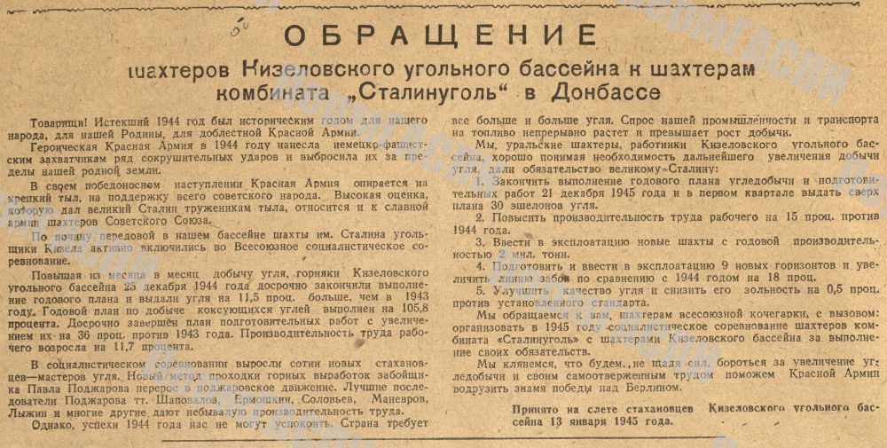 Текст обращения шахтеров Кизеловского угольного бассейна к шахтерам комбината «Сталинуголь» в Донбассе, принятого на слете стахановцев Кизеловского угольного бассейна, состоявшемся 13 января 1945 г. ПермГАСПИ. Ф.5738. Оп.27. Д.64. Л.12