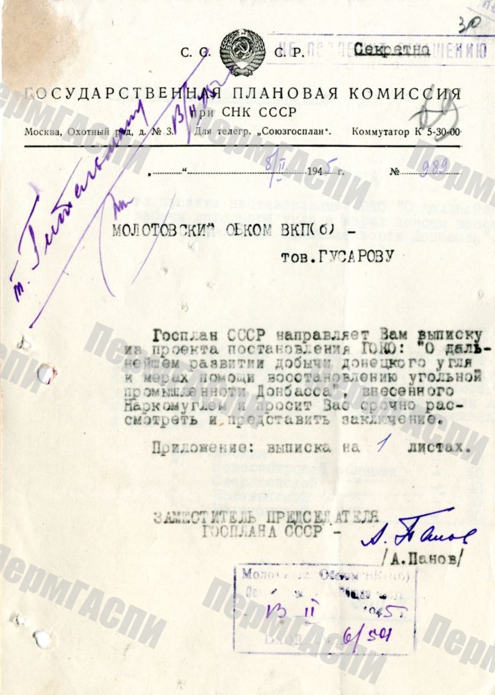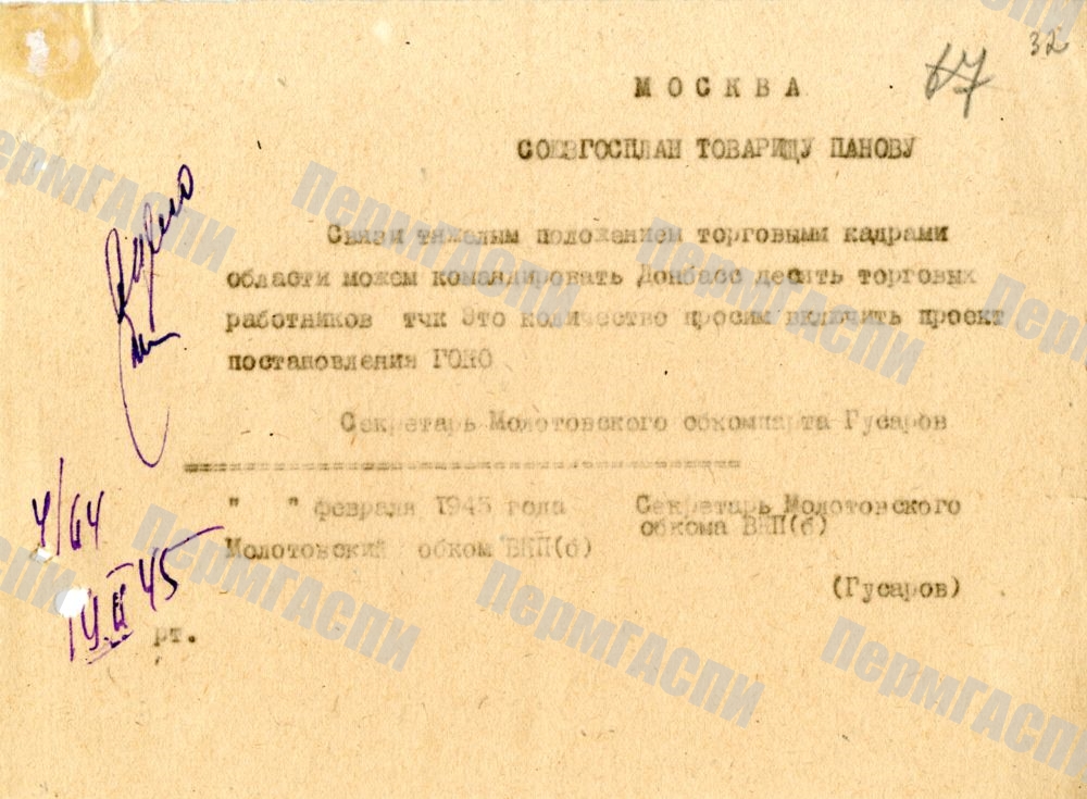 Письмо, направленное заместителем председателя Госплана СССР А.Д. Пановым первому секретарю Молотовского обкома ВКП(б) Н.И. Гусарову по вопросу об отправке на Донбасс работников торговли из Молотовской области. 8 февраля 1945 г. ПермГАСПИ. Ф.105. Оп.11. Д.173. Л.30-31