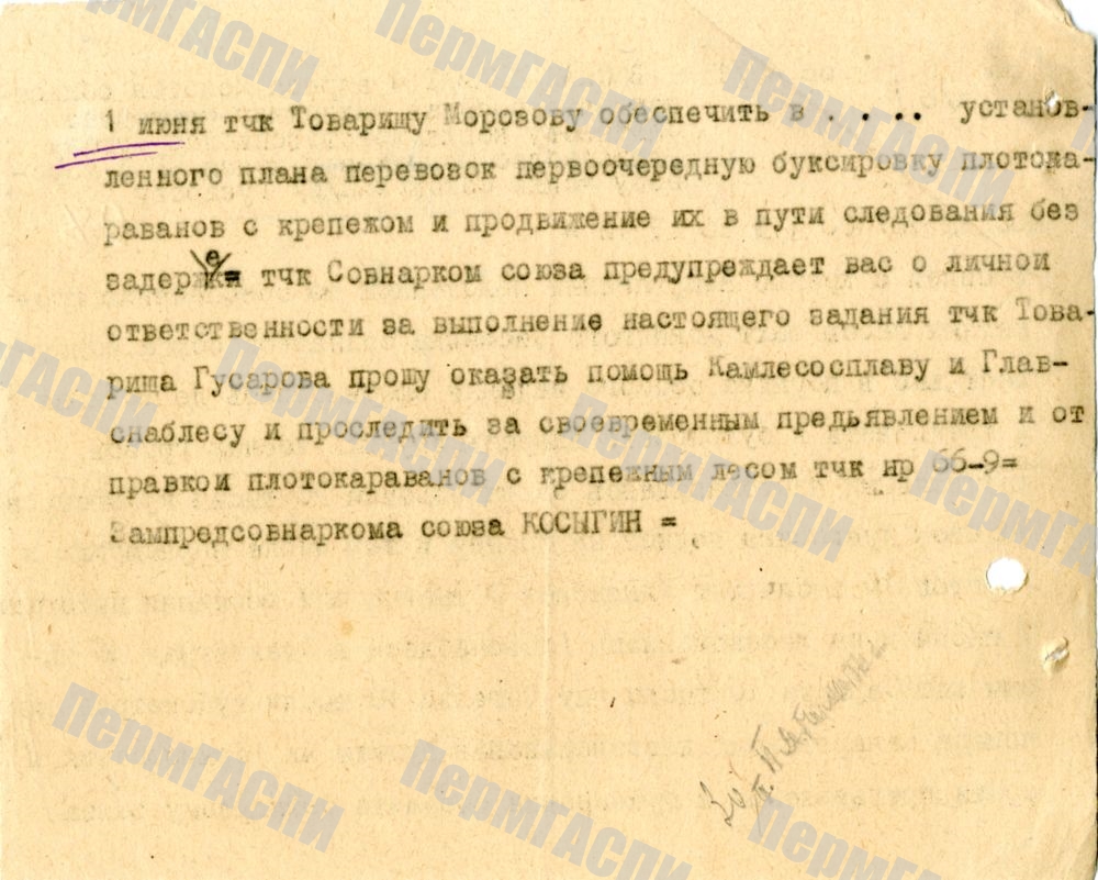 Телеграмма, направленная заместителем председателя Совнаркома СССР А.Н. Косыгиным в Молотовский обком ВКП(б) по вопросу об отправке древесины из Молотовской области для шахт Донбасса. 28 мая 1945 г. ПермГАСПИ. Ф.105. Оп.11. Д.152. Л.54