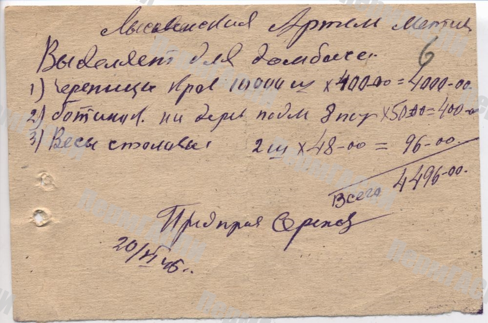 Письмо, направленное председателем правления Лысьвенской артели «Метиз» в Лысьвенский горком ВКП(б) с информацией об участии коллектива артели в оказании помощи Донбассу. 20 июня 1945 г. ПермГАСПИ. Ф.85. Оп.26. Д.380. Л.6