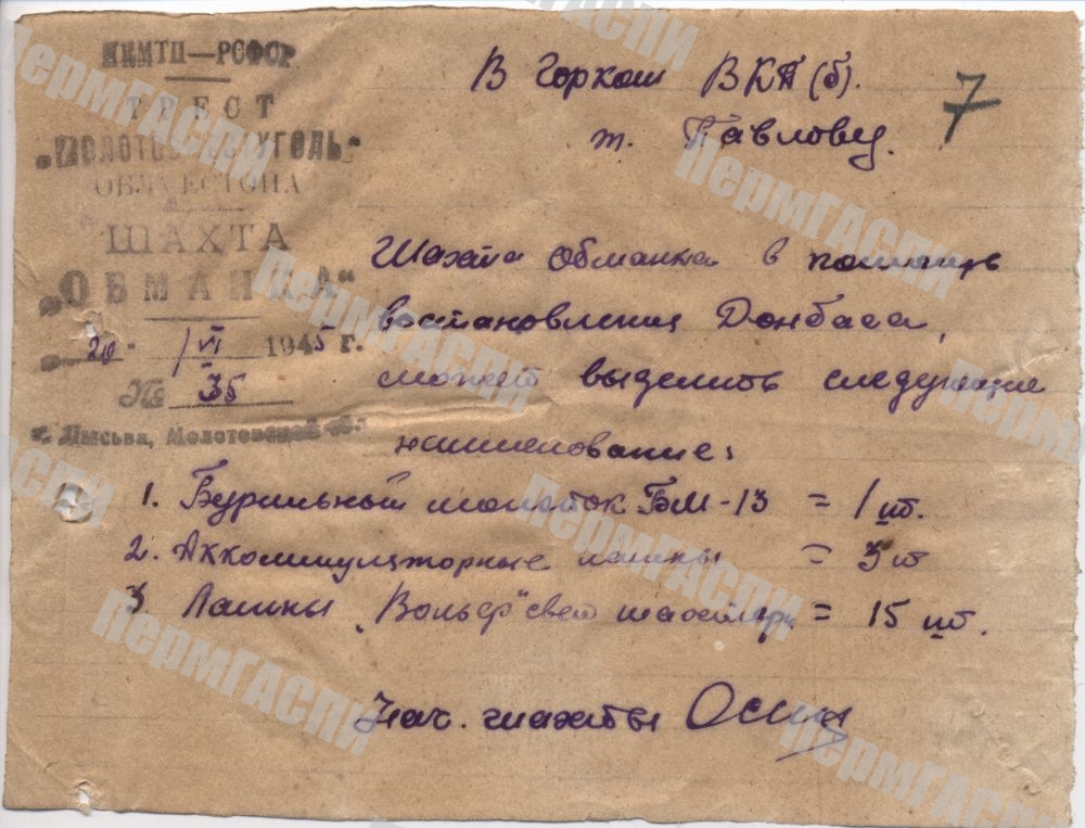 Письмо, направленное начальником шахты «Обманка» треста «Молотовместуголь» в Лысьвенский горком ВКП(б) с информацией об участии коллектива шахты в оказании помощи Донбассу. 20 июня 1945 г. ПермГАСПИ. Ф.85. Оп.26. Д.380. Л.7