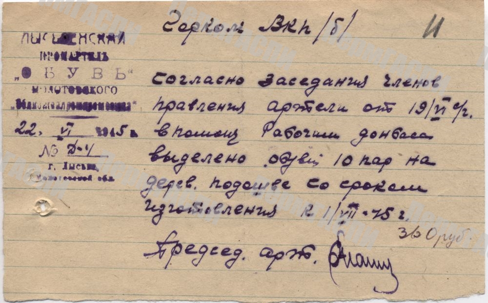 Письмо, направленное председателем правления Лысьвенской артели «Обувь» в Лысьвенский горком ВКП(б) с информацией об участии коллектива артели в оказании помощи Донбассу. 22 июня 1945 г. ПермГАСПИ. Ф.85. Оп.26. Д.380. Л.11