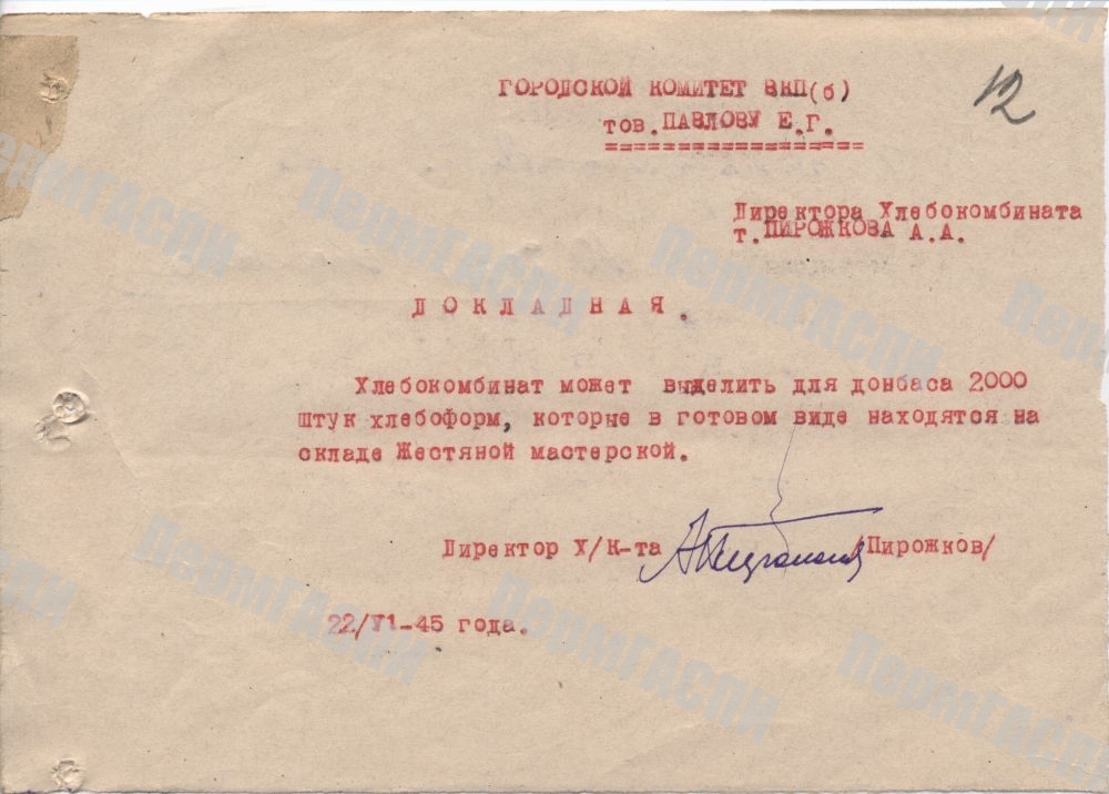 Письмо, направленное директором Лысьвенского хлебокомбината в Лысьвенский горком ВКП(б) с информацией об участии коллектива хлебокомбината в оказании помощи Донбассу. 22 июня 1945 г. ПермГАСПИ. Ф.85. Оп.26. Д.380. Л.12