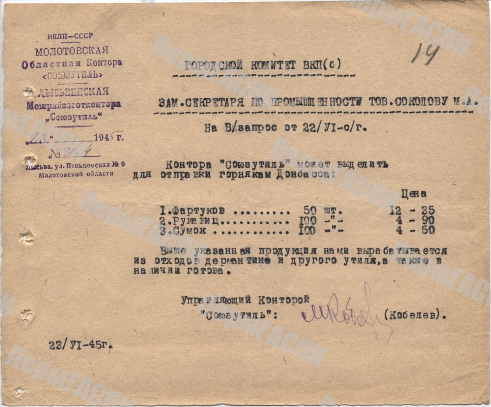 Письмо, направленное управляющим Лысьвенской межрайзаготконторой «Союзутиль» в Лысьвенский горком ВКП(б) с информацией об участии коллектива конторы в оказании помощи Донбассу. 23 июня 1945 г. ПермГАСПИ. Ф.85. Оп.26. Д.380. Л.14