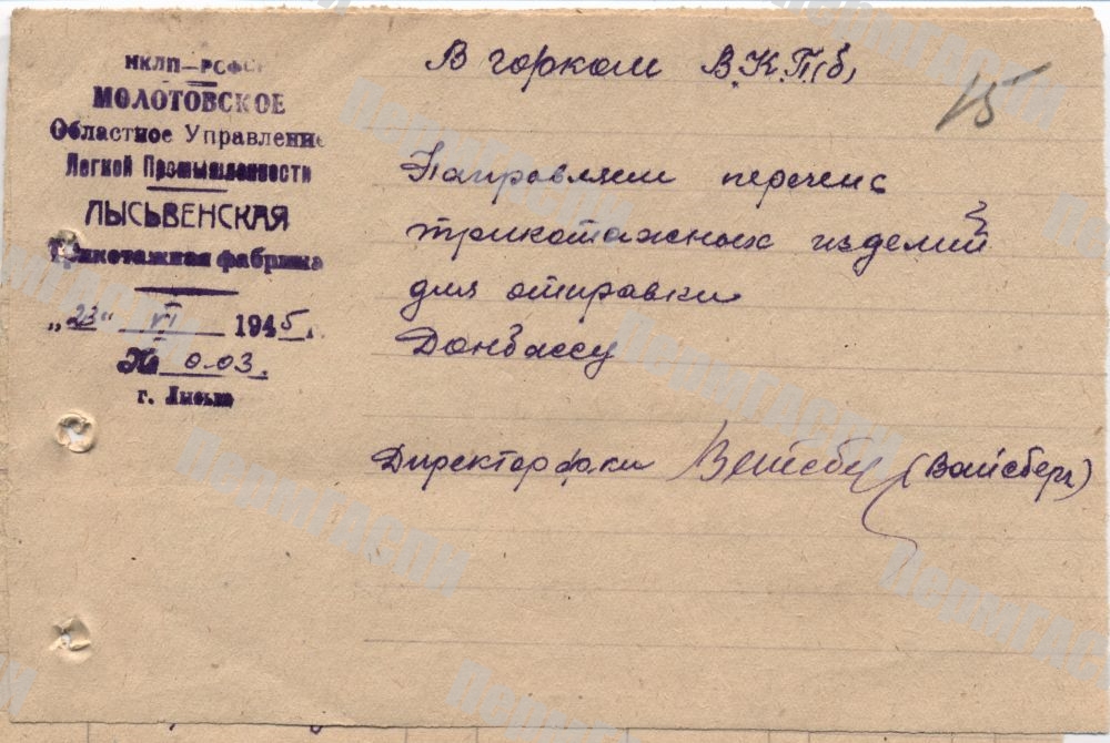 Письмо, направленное директором Лысьвенской трикотажной фабрики в Лысьвенский горком ВКП(б) с информацией об участии коллектива фабрики в оказании помощи Донбассу. 23 июня 1945 г. ПермГАСПИ. Ф.85. Оп.26. Д.380. Л.15-16