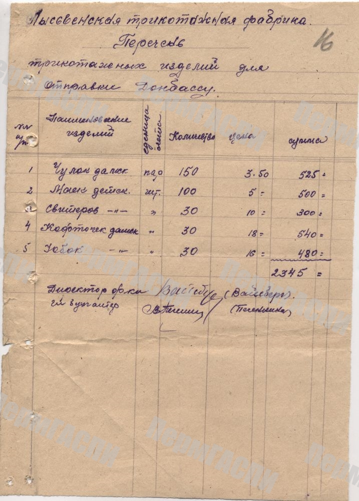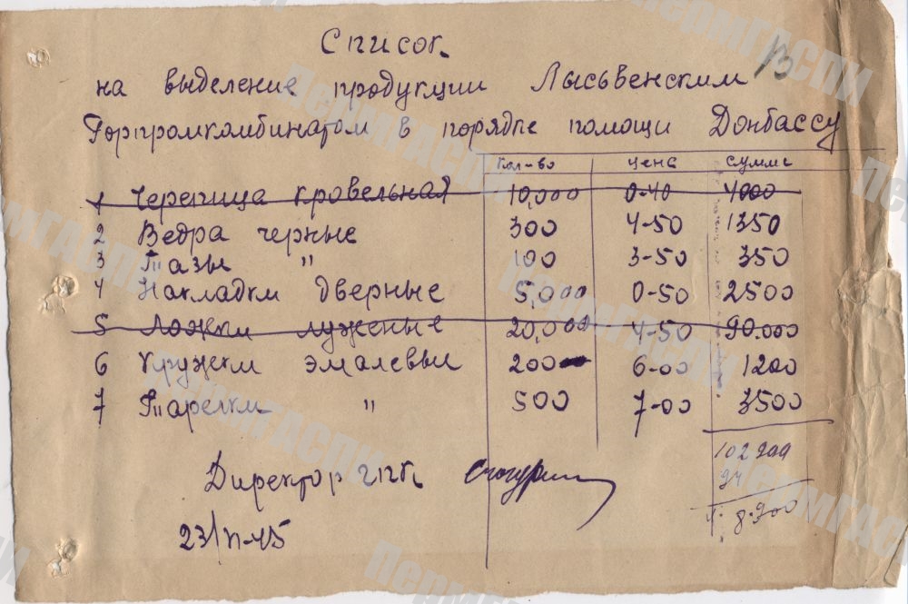 Список продукции, выделенной Лысьвенским промкомбинатом для отправки в помощь Донбассу. 23 июня 1945 г. ПермГАСПИ. Ф.85. Оп.26. Д.380. Л.13