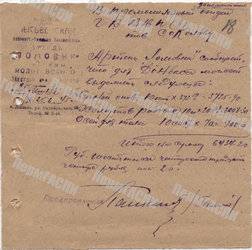 Письмо, направленное председателем правления Лысьвенской артели «Ломовик» в Лысьвенский горком ВКП(б) с информацией об участии коллектива артели в оказании помощи Донбассу. 25 июня 1945 г. ПермГАСПИ. Ф.85. Оп.26. Д.380. Л.18