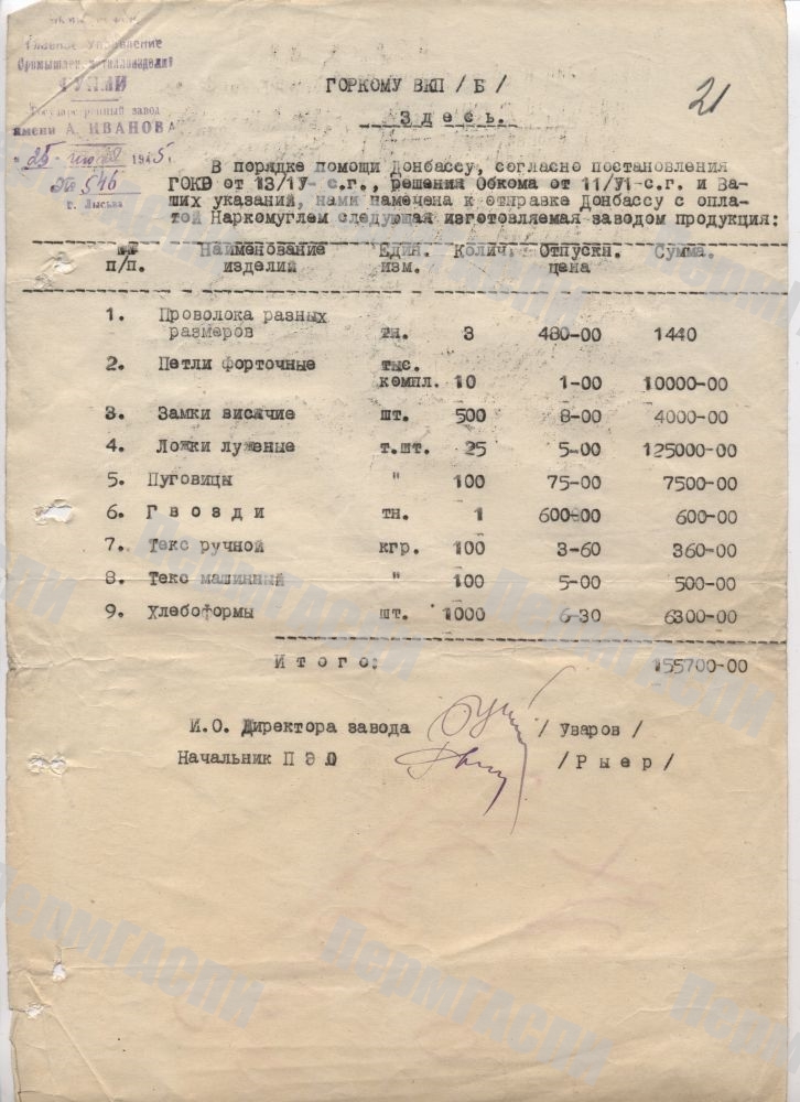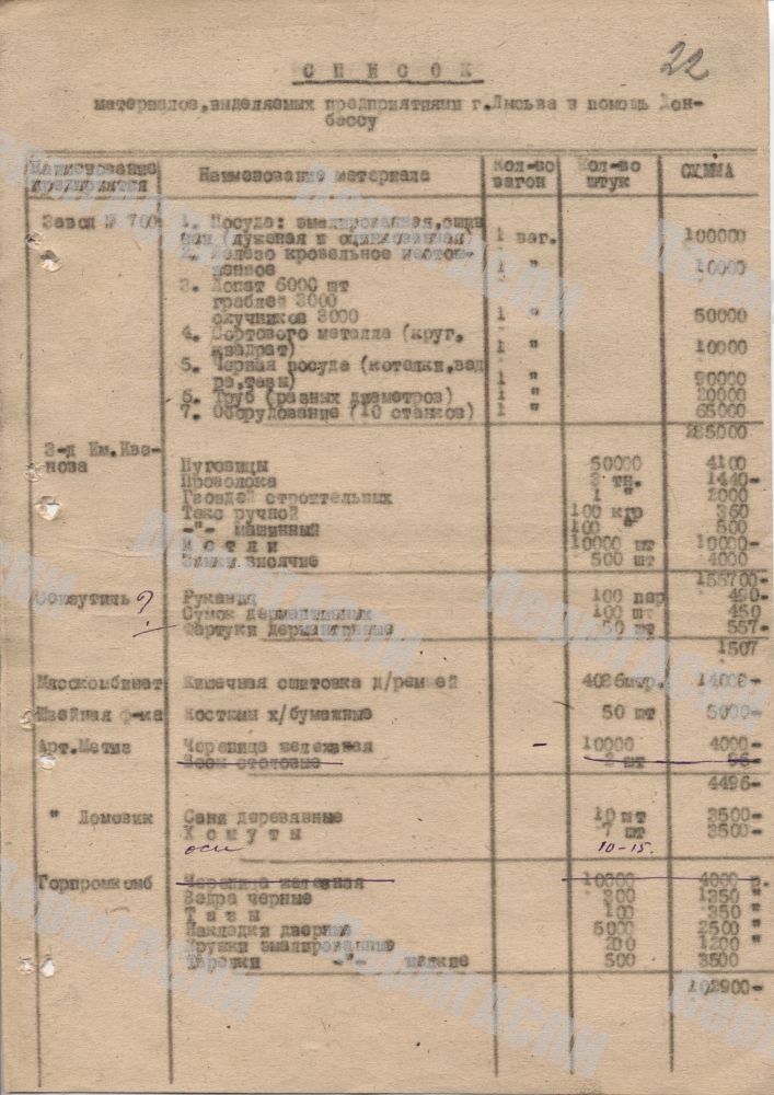 Список продукции, выделенной предприятиями г. Лысьвы Молотовской области для отправки в помощь Донбассу. Июнь 1945 г. ПермГАСПИ. Ф.85. Оп.26. Д.380. Л.22