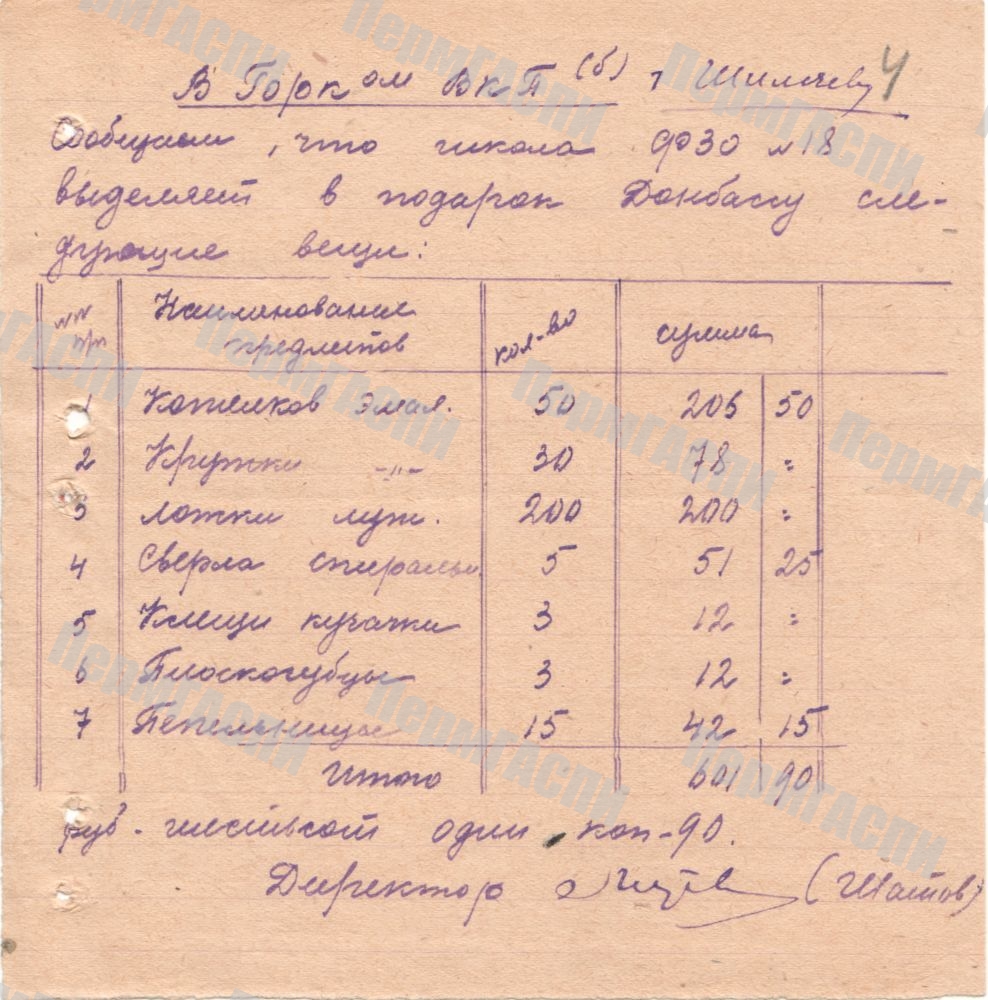 Письмо, направленное директором Лысьвенской школы ФЗО №18 в Лысьвенский горком ВКП(б) с информацией об участии коллектива школы в оказании помощи Донбассу. Июнь 1945 г. ПермГАСПИ. Ф.85. Оп.26. Д.380. Л.4