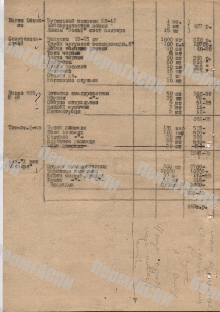 Справка об изготовлении на предприятиях Молотовской области силами комсомольцев и молодежи продукции для отправки ее в помощь Донбассу. 1944 г. ПермГАСПИ. Ф.1458. Оп.1. Д.392. Л.4-5