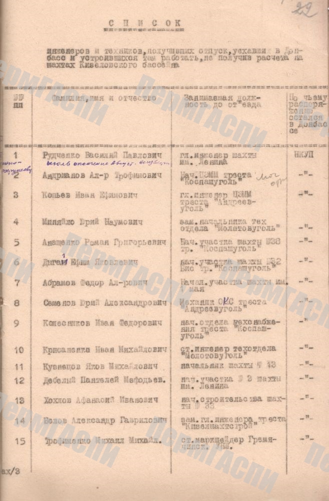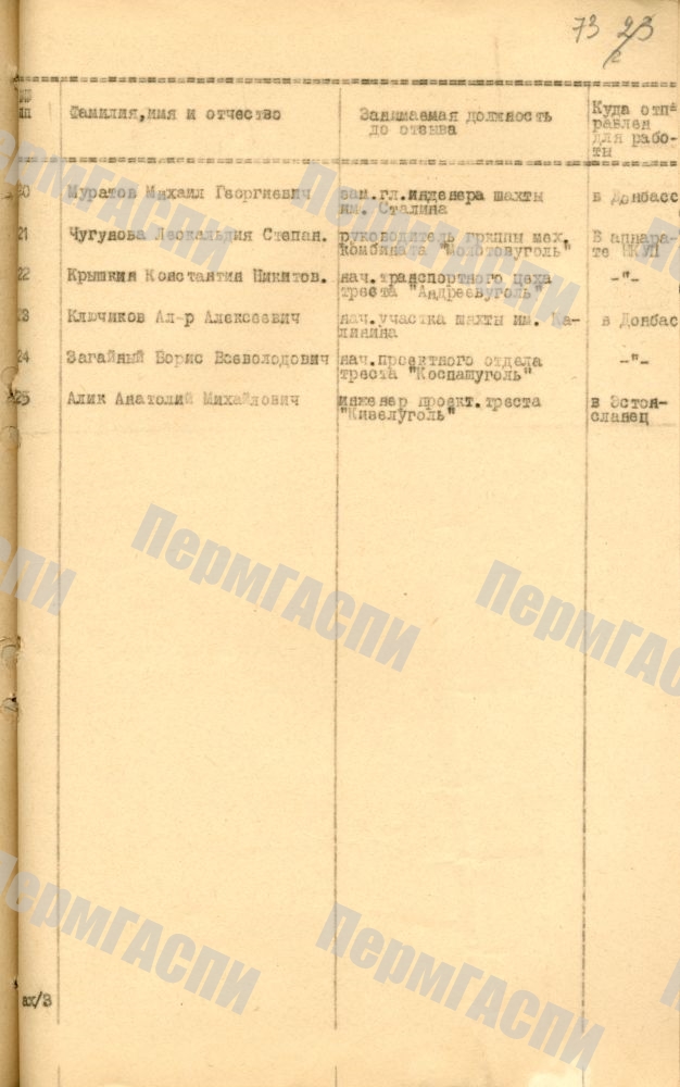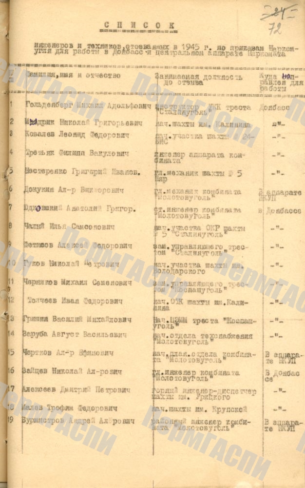 Список инженерно-технических работников предприятий угольной промышленности Молотовской области, отозванных для работы на Донбассе и в центральном аппарате Народного комиссариата угольной промышленности СССР в 1945 г. 1945 г. ПермГАСПИ. Ф.105. Оп.11. Д.549. Л.72-73