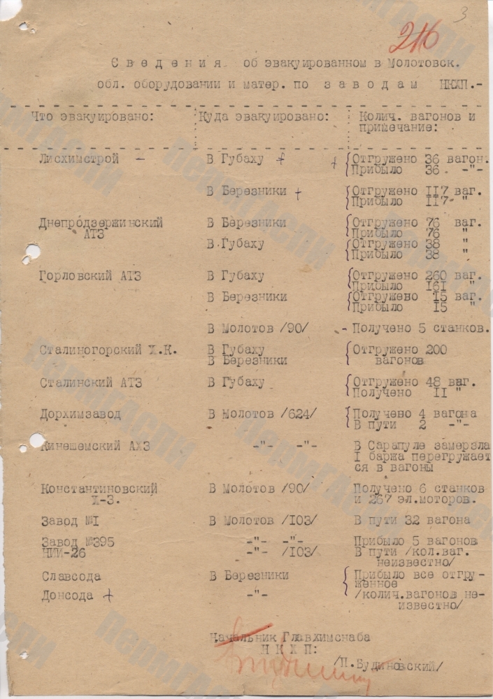 Сводка об эвакуации на территорию Молотовской области оборудования с предприятий химической промышленности из прифронтовой полосы. 1941 г. ПермГАСПИ. Ф.105. Оп.7. Д.386. Л.3