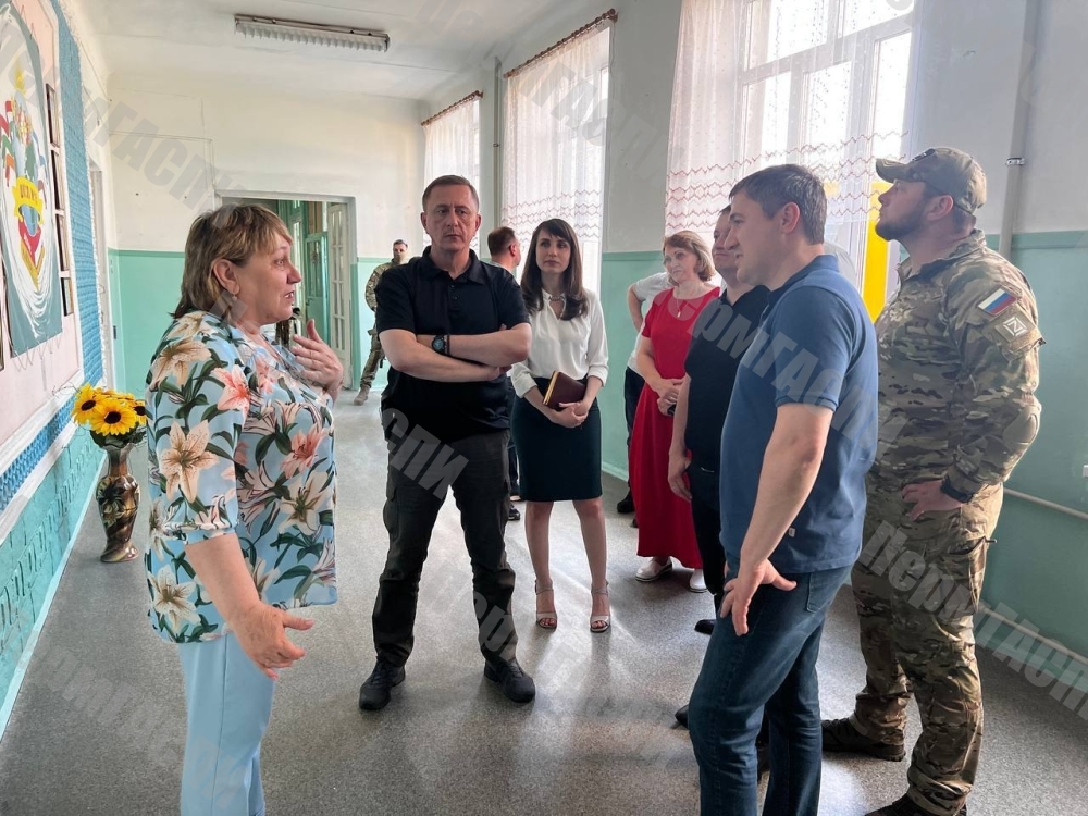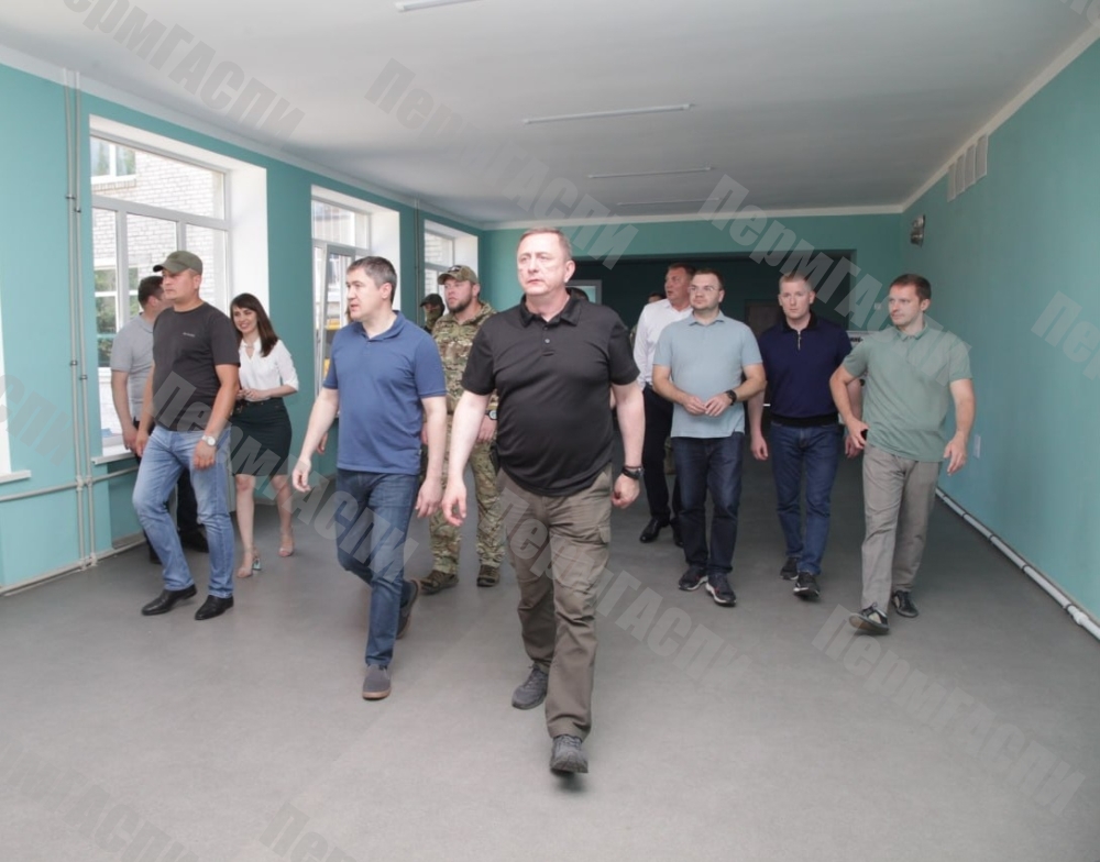 Губернатор Пермского края Д.Н. Махонин (второй справа) и глава администрации города Северодонецка Н.В. Моргунов (второй слева) осматривают восстановленное здание средней школы №15. г. Северодонецк. Июнь 2023 г. ПермГАСПИ. ВПД