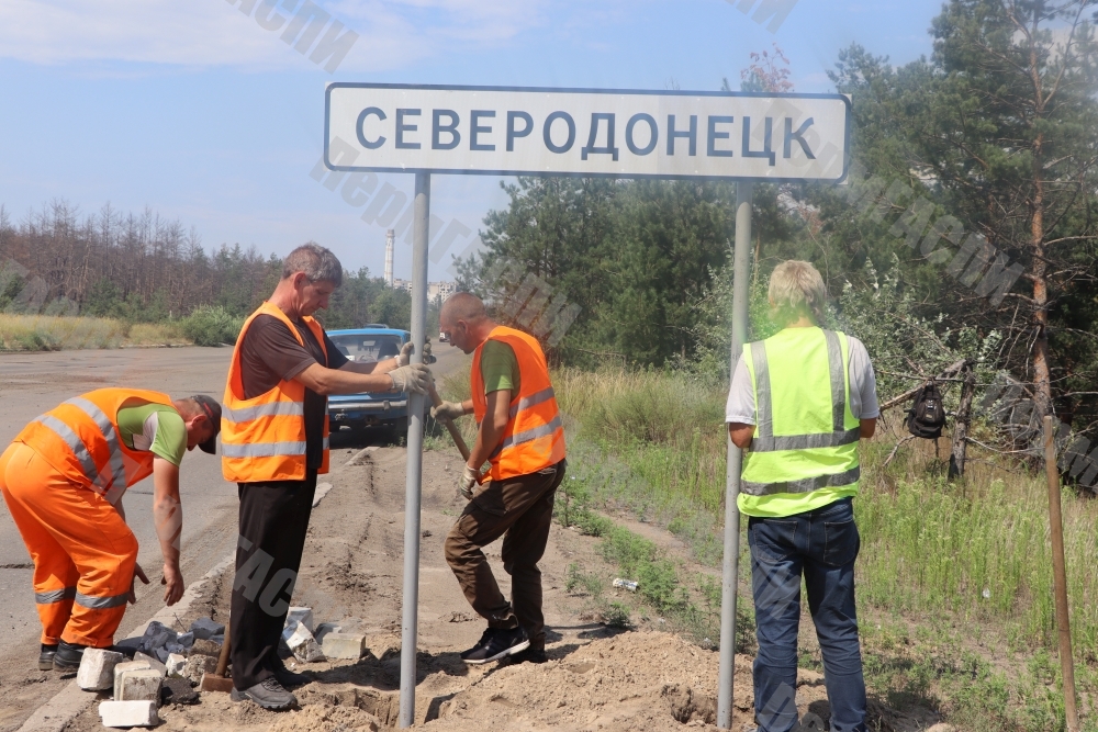 Рабочие устанавливают знак с названием города на въезде в Северодонецк в ходе ремонта дорог. ЛНР. 2023 г. ПермГАСПИ. ВПД
