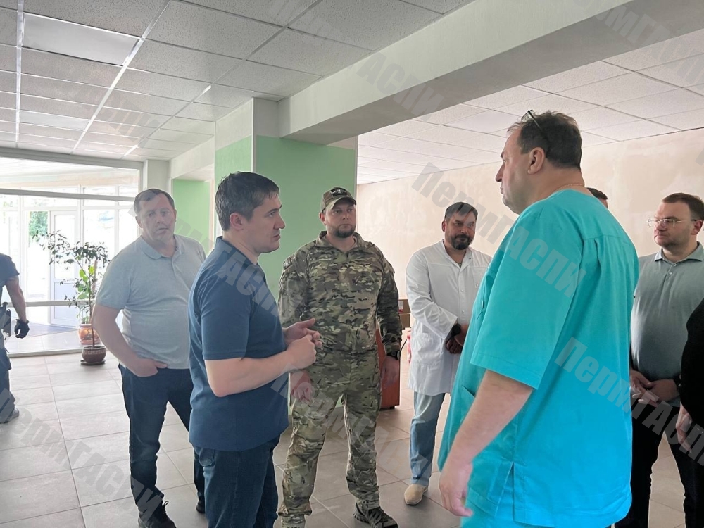Губернатор Пермского края Д.Н. Махонин (второй слева) на встрече с пермскими медиками, работающими в Северодонецкой городской больнице, в восстановлении здания которой принимали участие пермские строители. Июнь 2023 г. ПермГАСПИ. ВПД