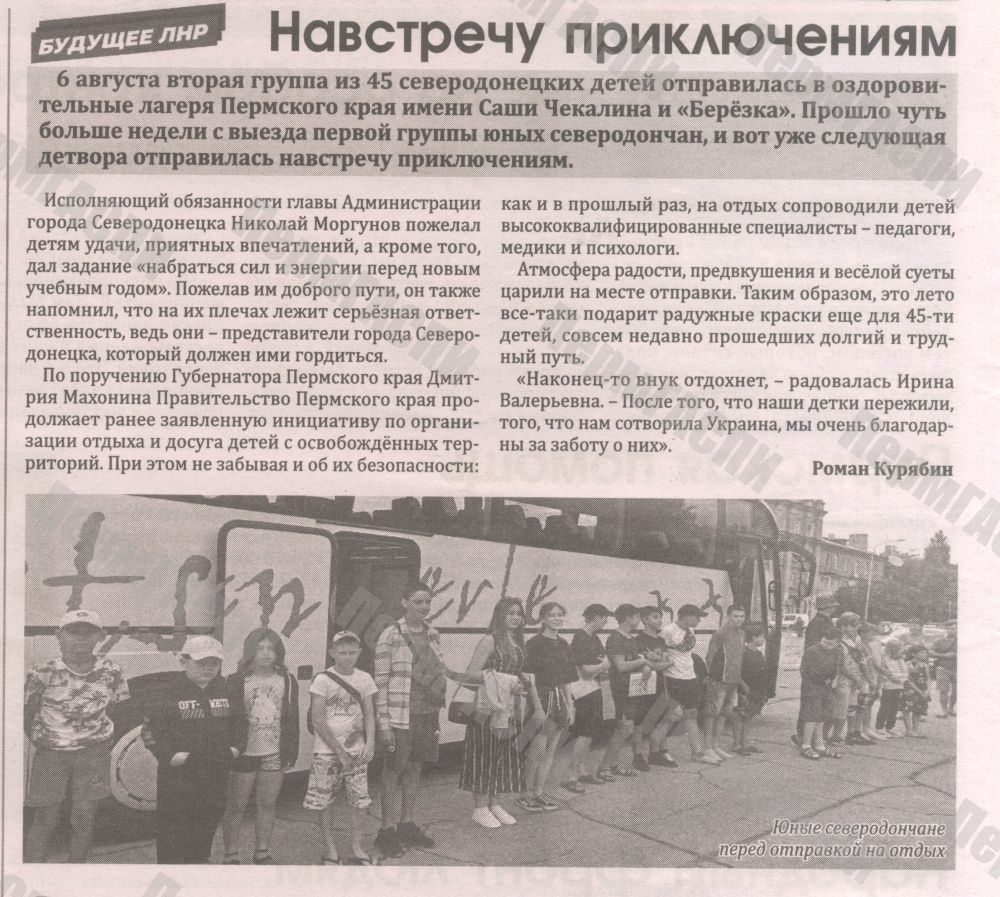 Школьники из Северодонецка приезжают в пермские лагеря отдыха, начиная с лета 2022 года. Всего в 2022-2023 годах Прикамье посетило семь групп ребят из Северодонецка, в Пермском крае побывали около 500 детей. Дети приезжают на спортивные сборы, для участия в экологических сменах и просто отдохнуть в летних лагерях. С 2023 года организована особая инклюзивная смена, в которой отдых направлен на активное включение ребят с ограниченными возможностями здоровья в среду сверстников.