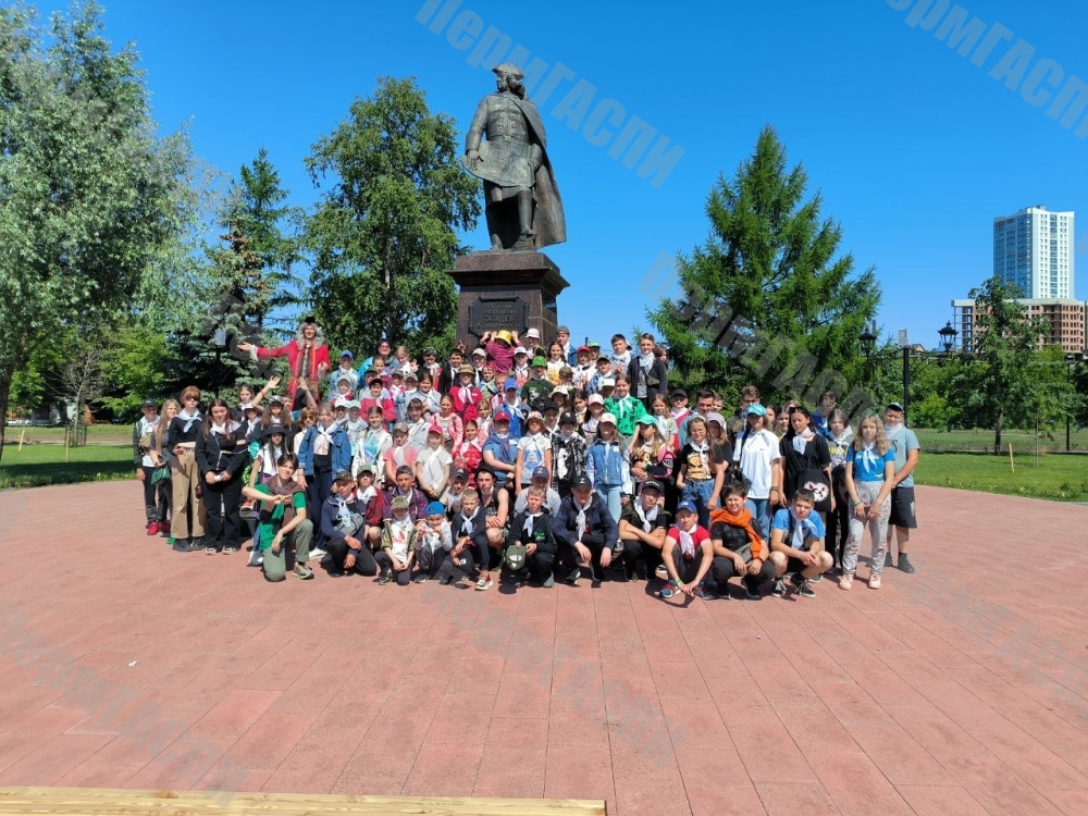 Школьники из Северодонецка в городе Перми возле памятника основателю города В.Н. Татищеву. 2023 г. ПермГАСПИ. ВПД