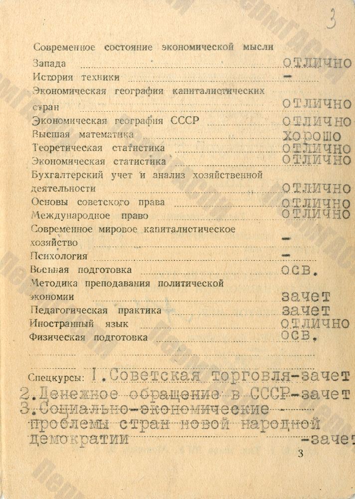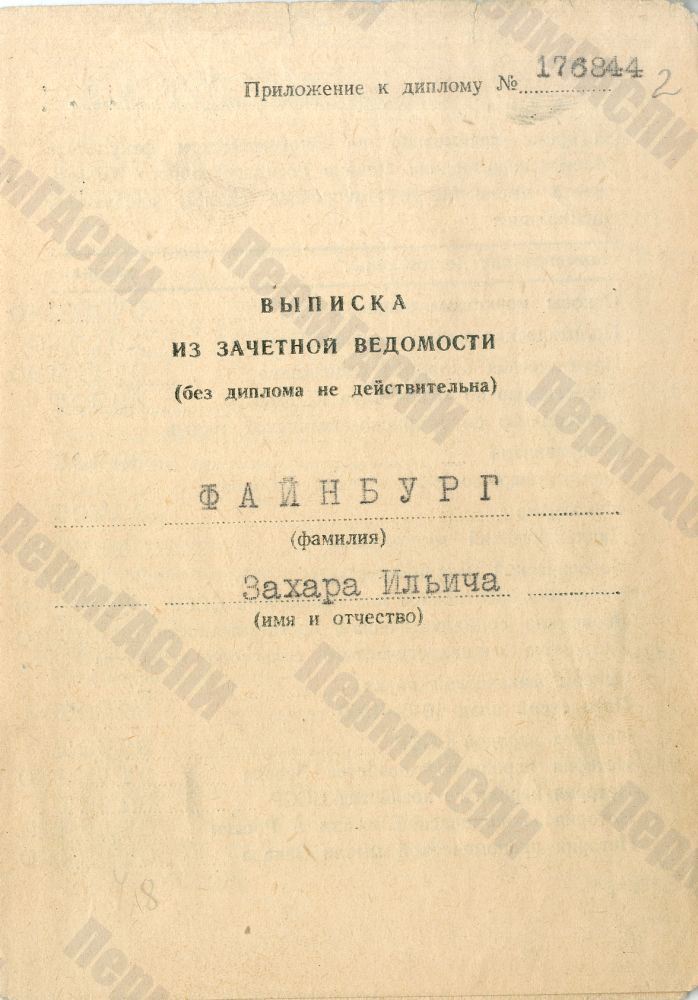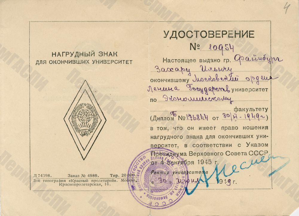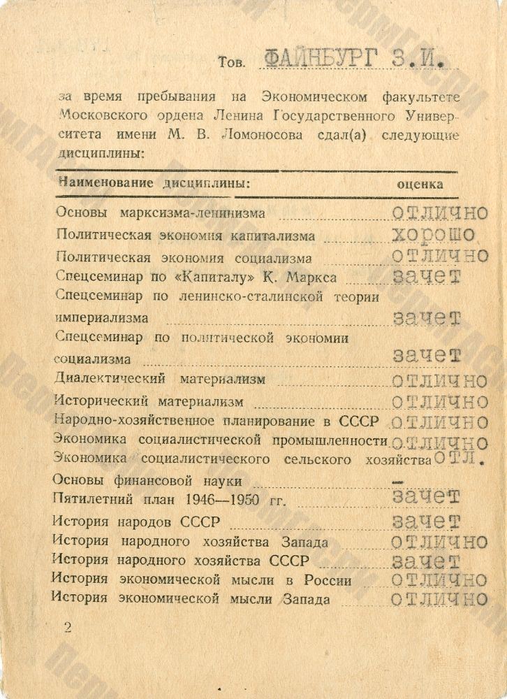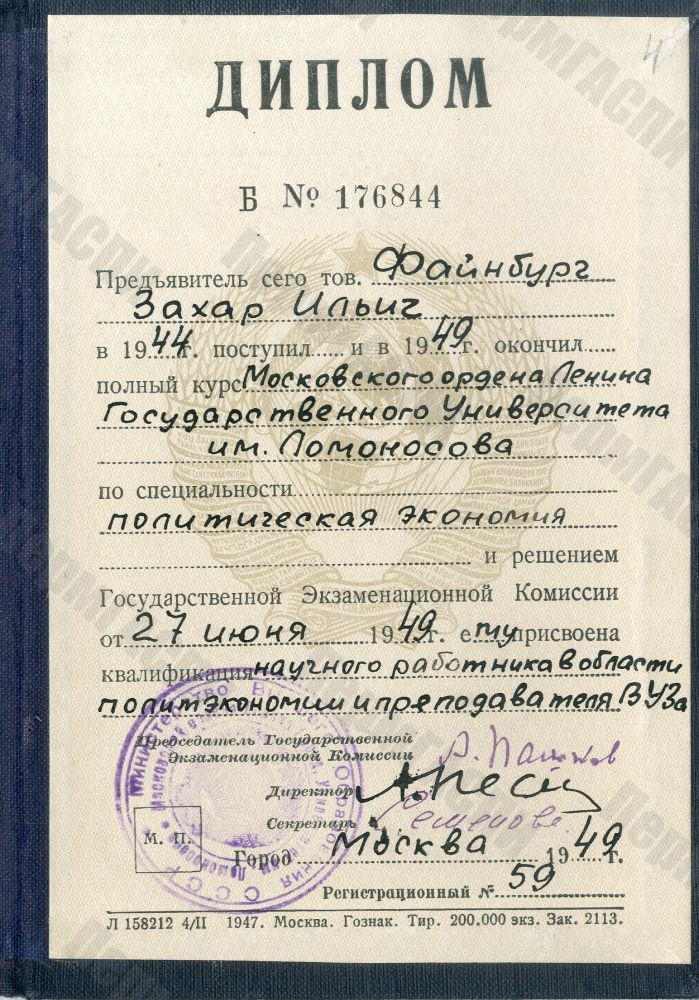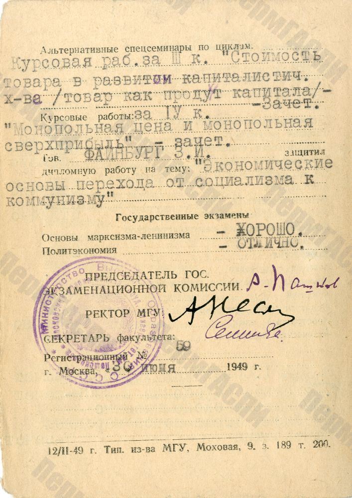 В 1949 г. З.И. Файнбург окончил МГУ с квалификацией «преподаватель политэкономии».